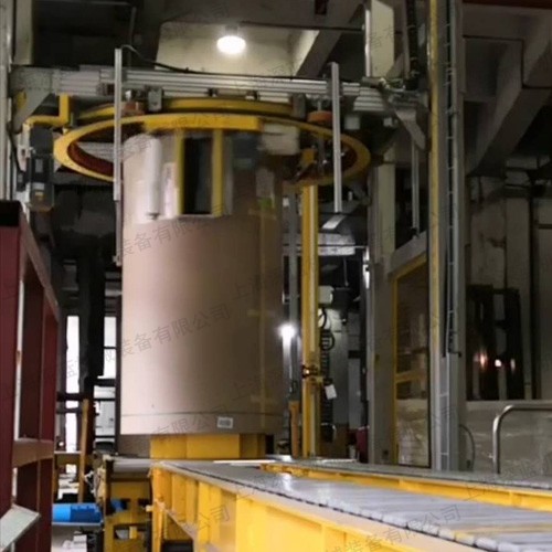 1.1、碼垛好的托盤產品經輸送線自動進入環(huán)式包裝機工位,纏繞包裝機得到啟動信號后自動四周纏繞包裝,經設定的包裝參數包裝完畢后,自動上膜斷膜,自動輸送到后續(xù)輸送線上;